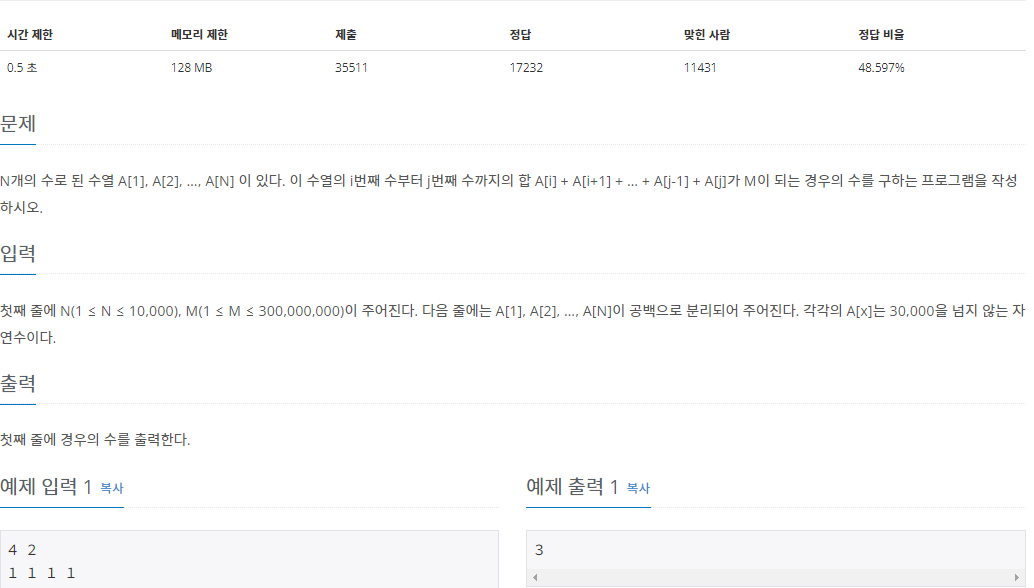[백준] 2003번 수들의 합 2 (투포인터 알고리즘)