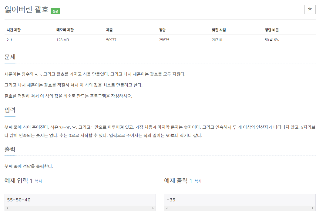 [백준] 1541번 잃어버린 괄호 (문자열)