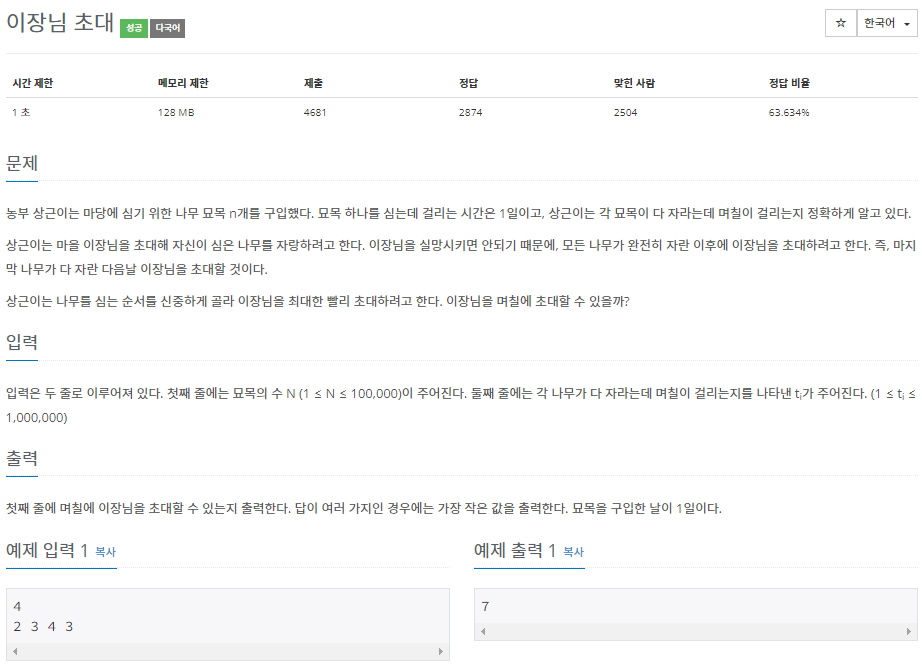 3) 묘목 다 자라는 날(위의 최댓값) 다음날 이장님 부르기